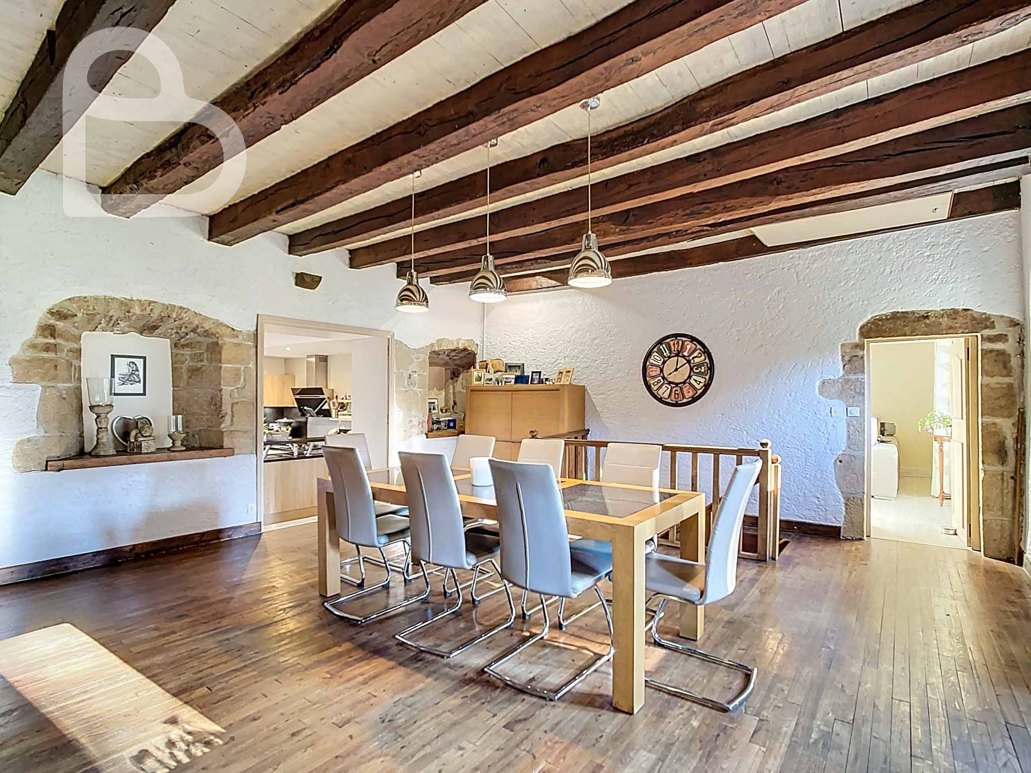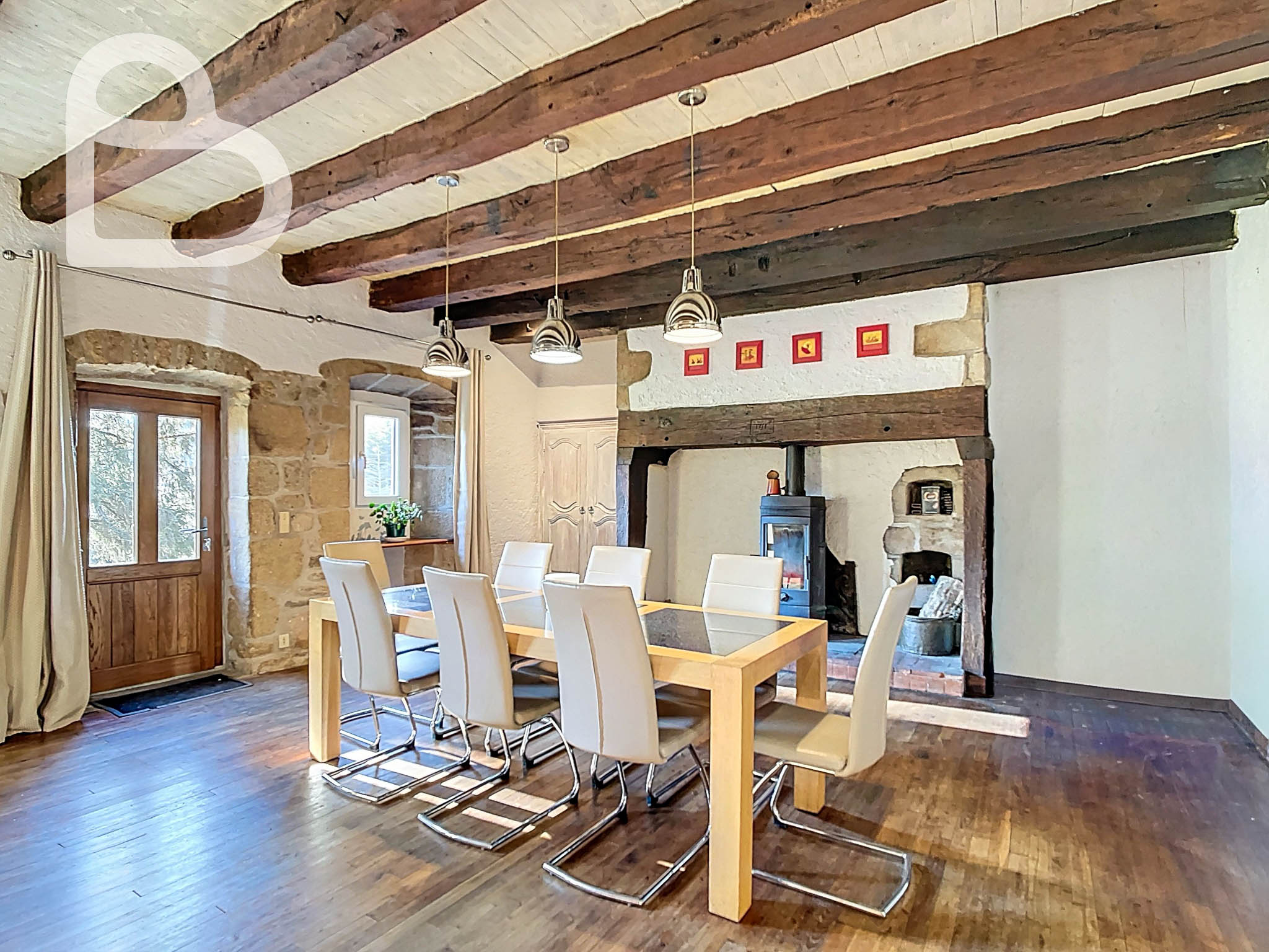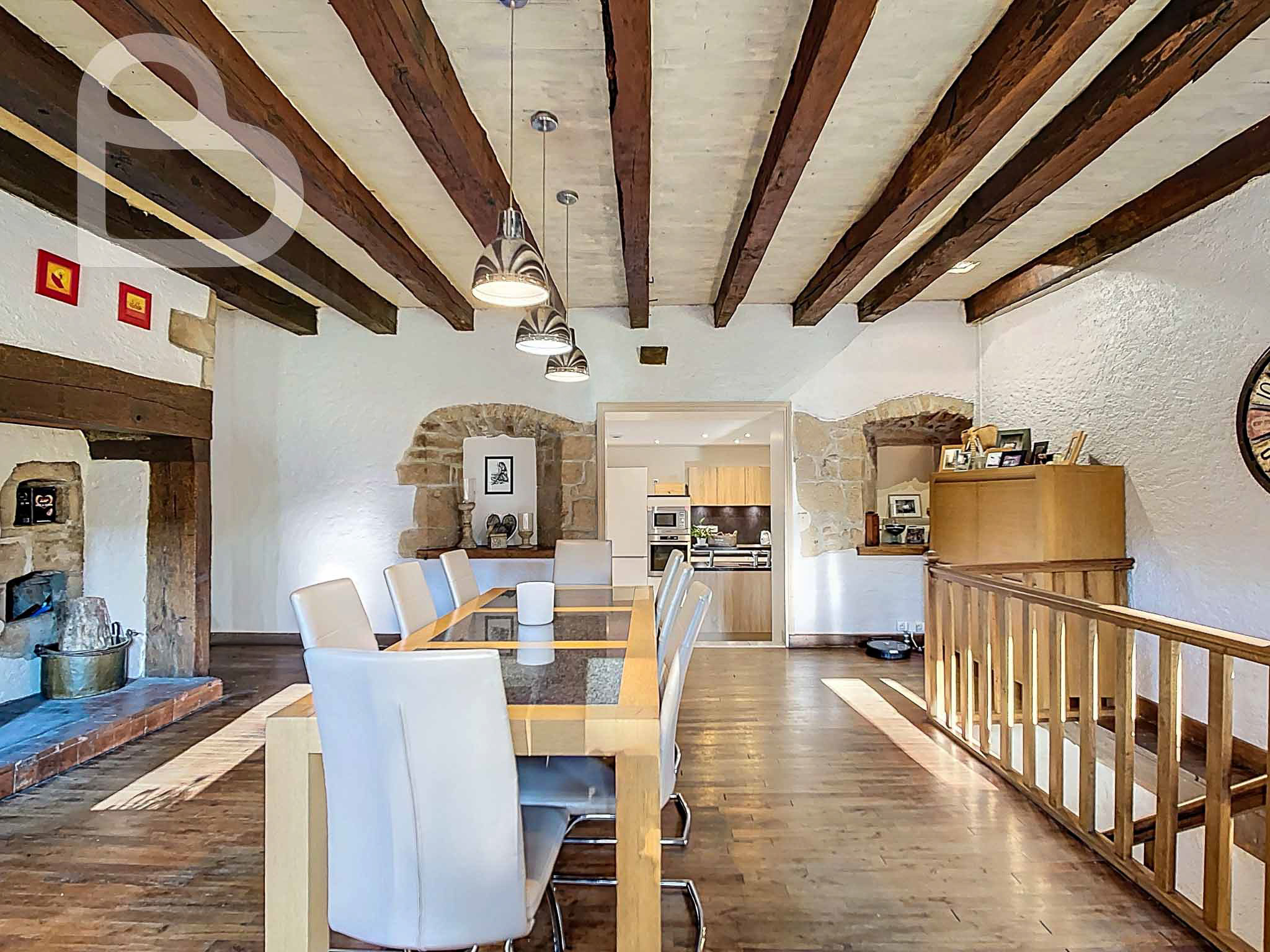 Aan de voorzijde van deze verdieping bevindt zich een sfeervolle eetplaats met zichtbare houten balken, een parketvloer en een houtkachel.