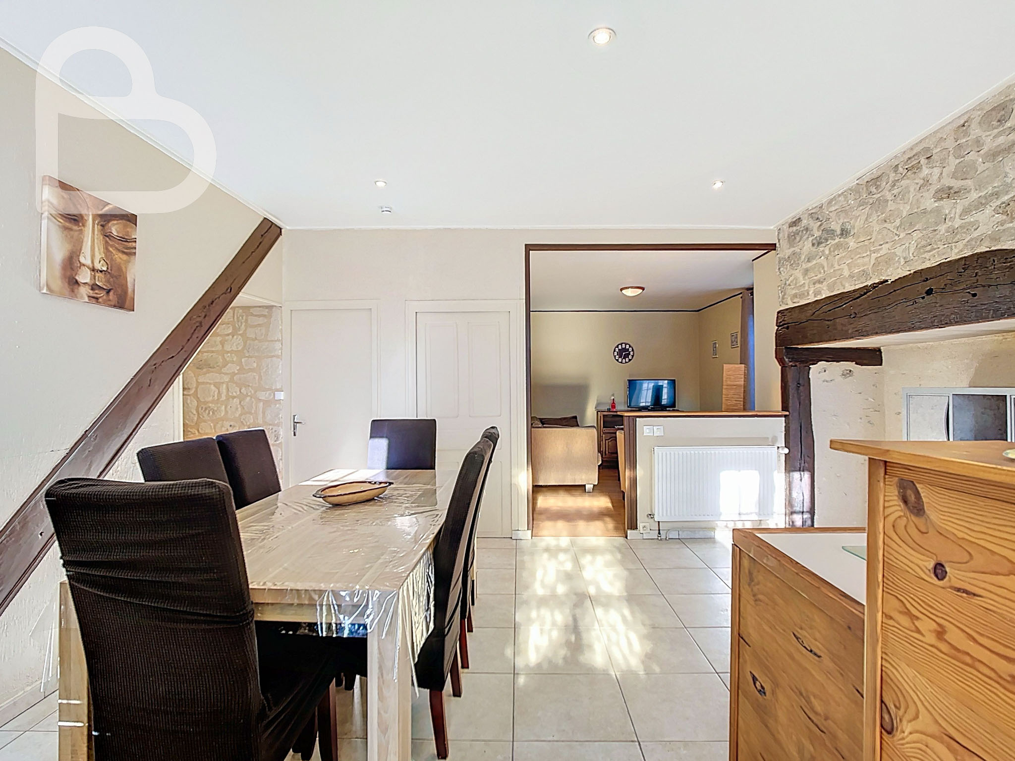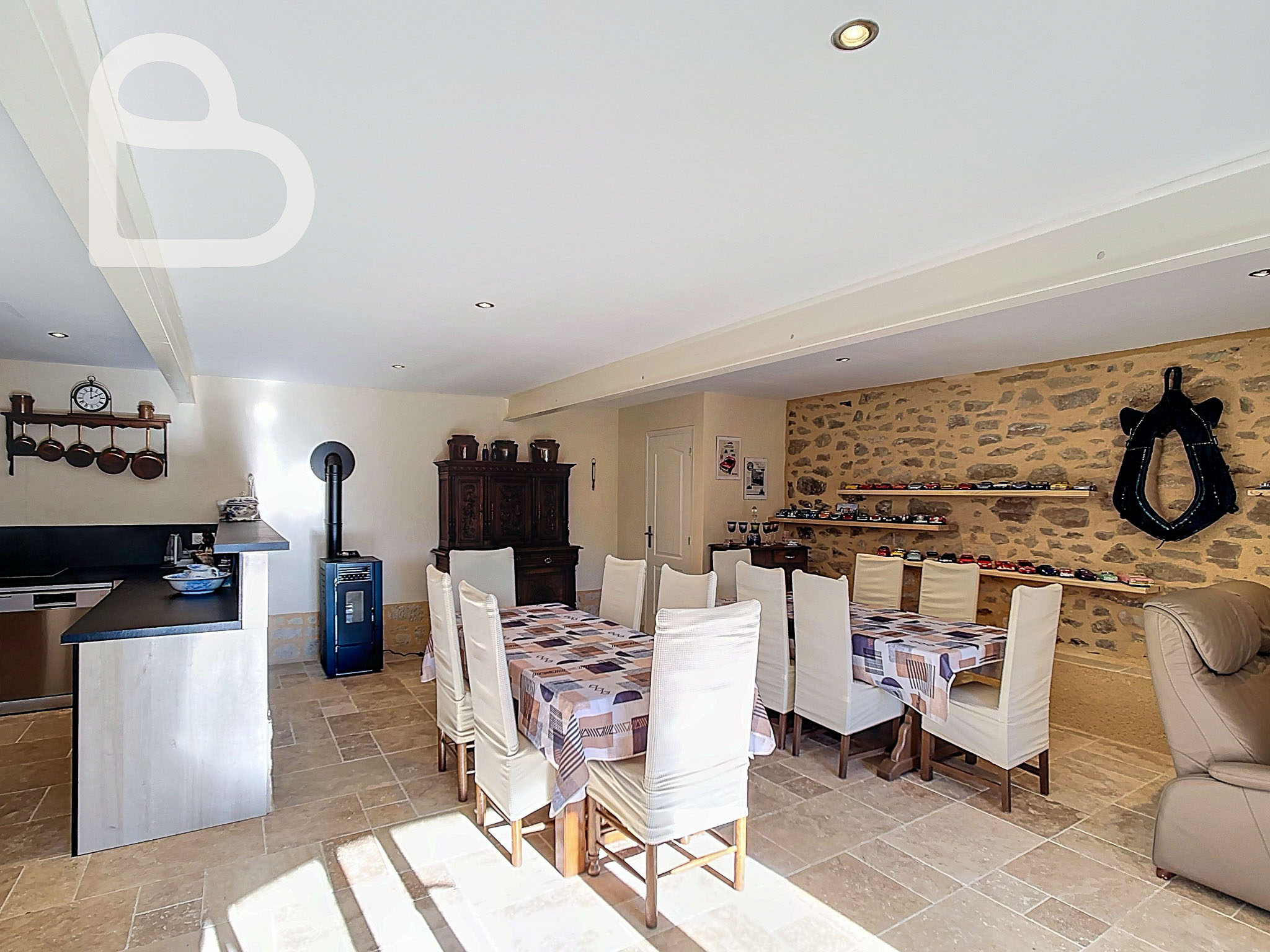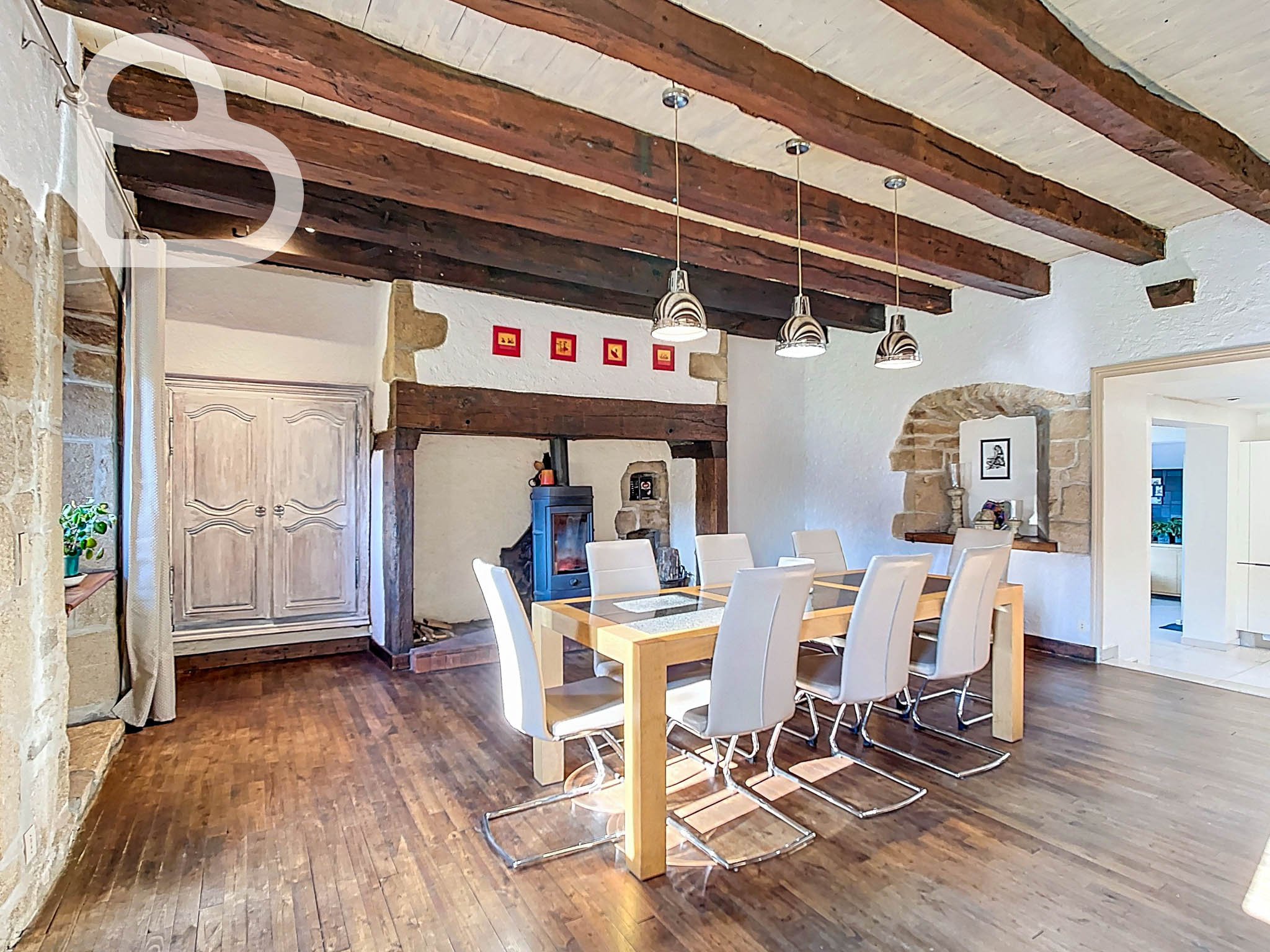 Aan de voorzijde van deze verdieping bevindt zich een sfeervolle eetplaats met zichtbare houten balken, een parketvloer en een houtkachel.