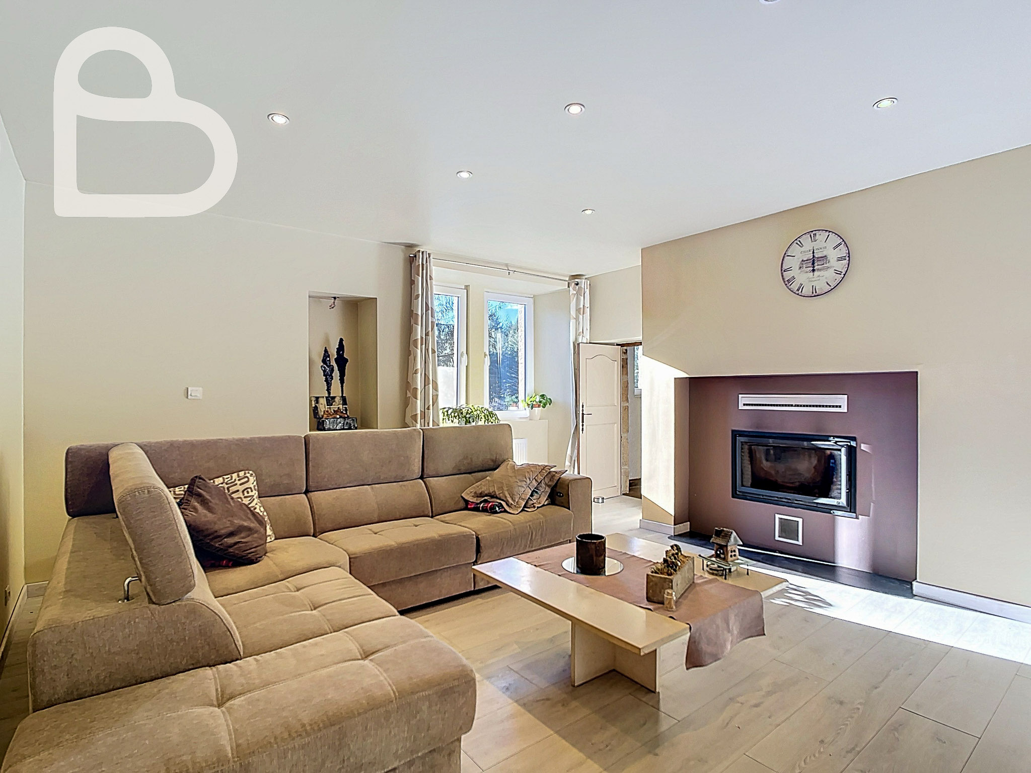 Aansluitend ligt het salon, eveneens met parketvloer en een ingebouwde houtkachel, dat in een iets modernere stijl werd afgewerkt.