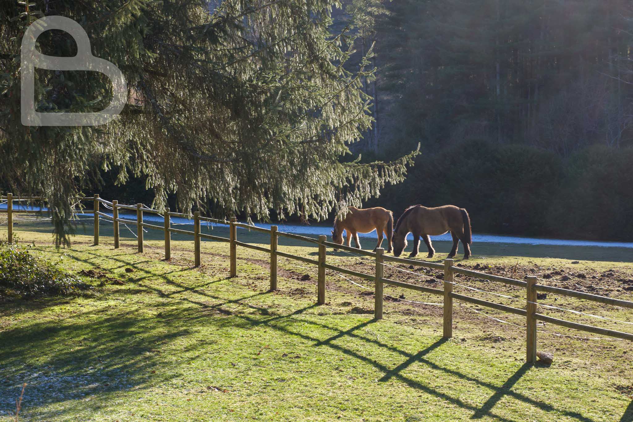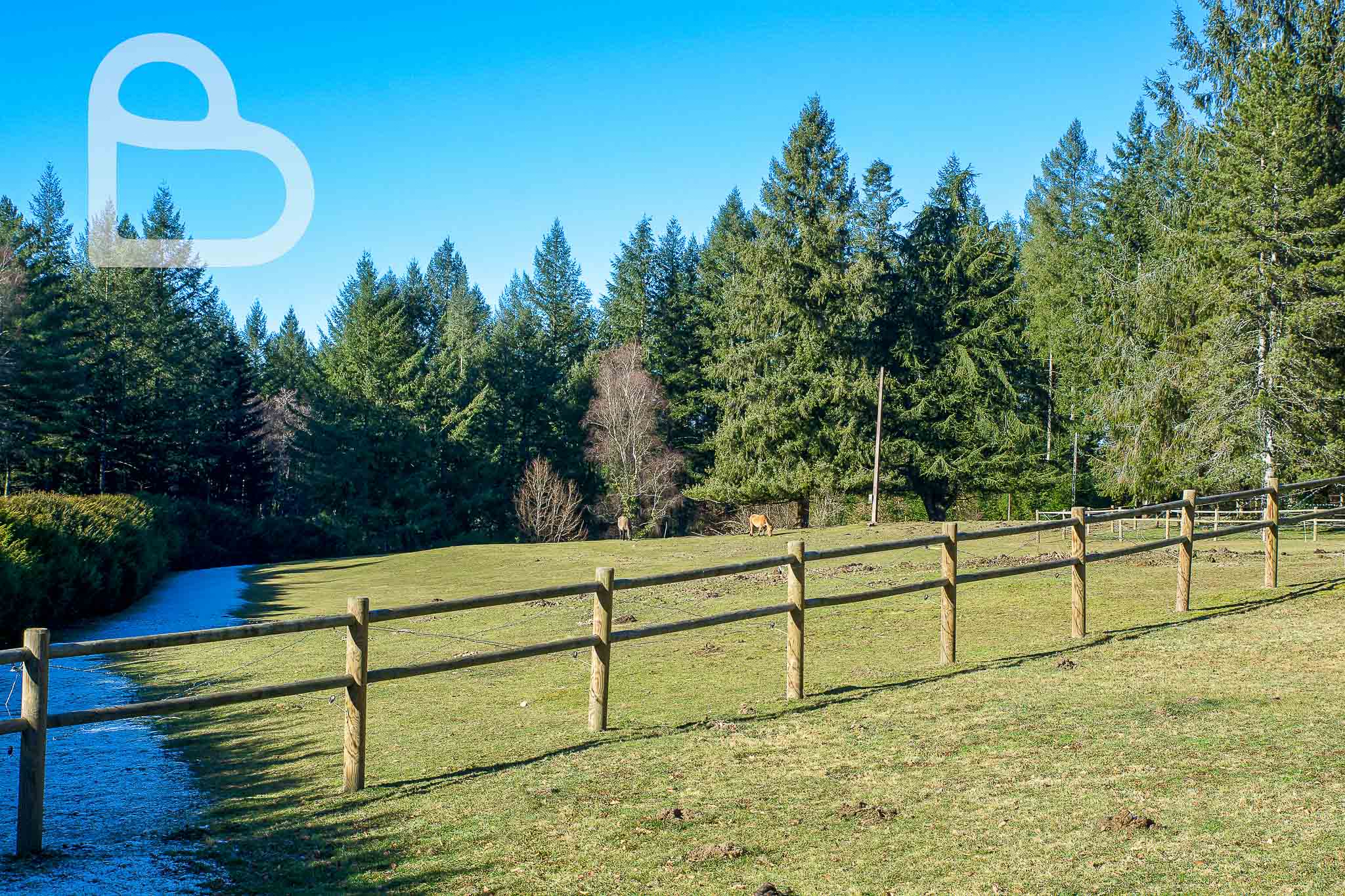 De weiden voor paarden, omgeven door houten omheiningen, maken dit geheel op harmonieuze wijze compleet.