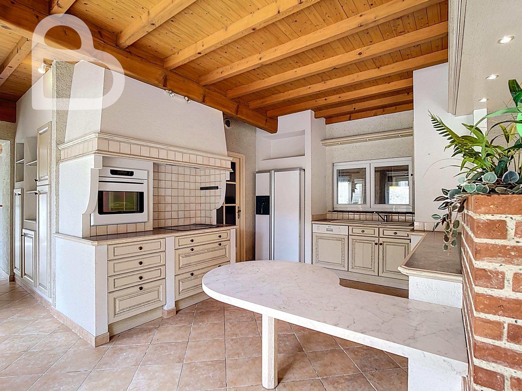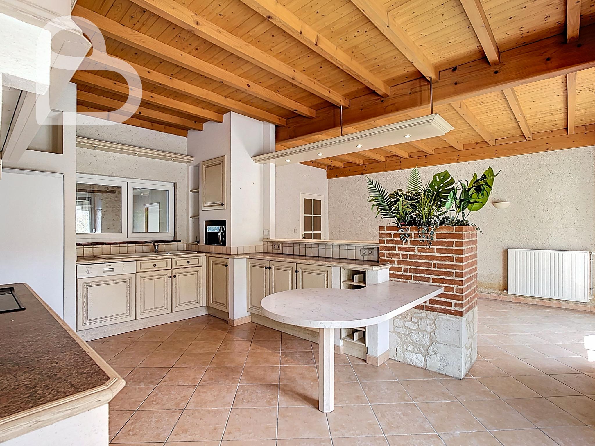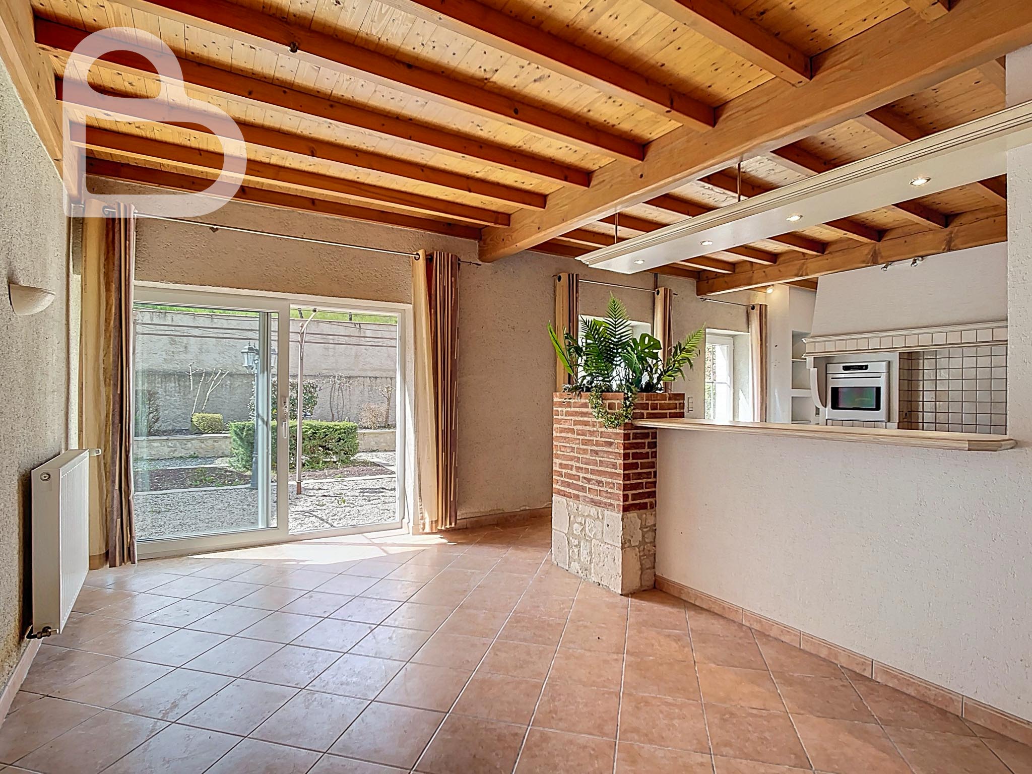 La maison dispose d'un séjour spacieux et lumineux, ainsi que d'une grande cuisine avec accès direct au jardin. L’espace extérieur est un véritable atout : un vaste jardin orienté plein sud avec, à l’arrière, une vue sur la verdure et la nature, une combinaison rare en plein centre du village. Un garage indépendant complète l'ensemble.