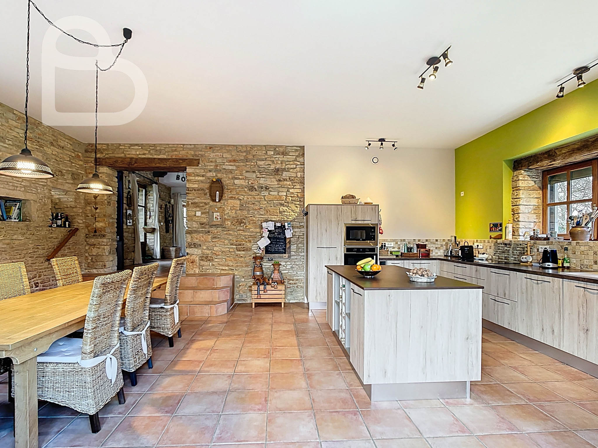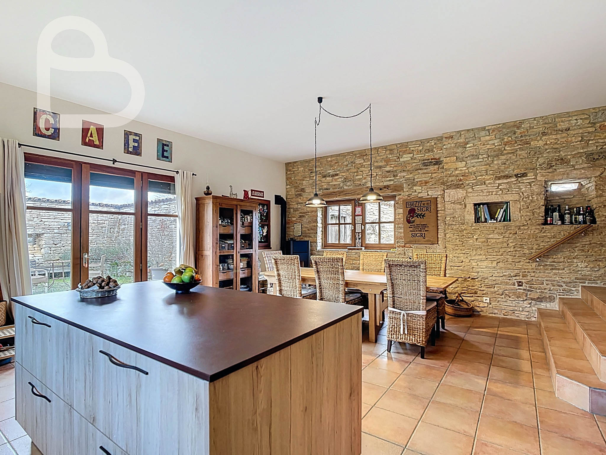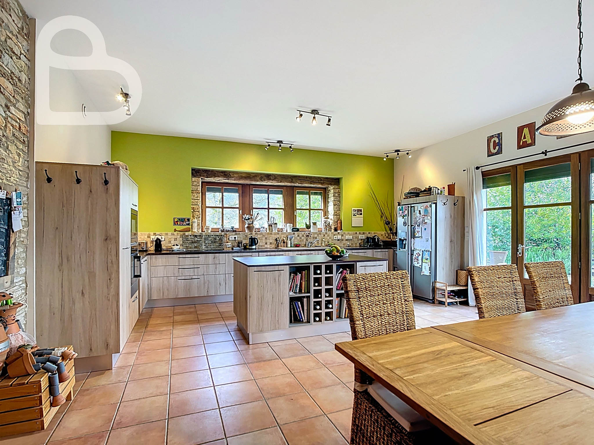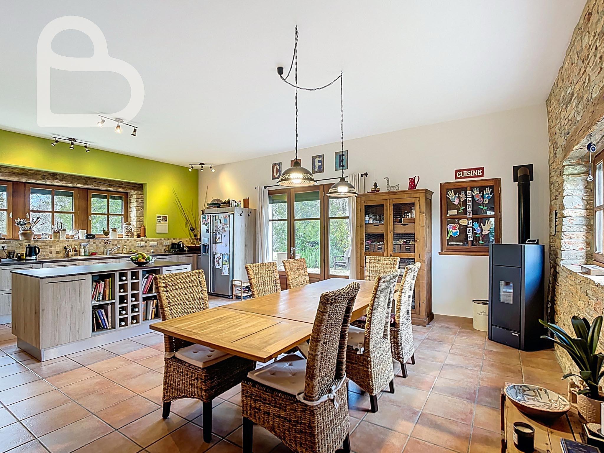 D’un côté, il mène à une spacieuse cuisine-salle à manger baignée de lumière, équipée d’un poêle à pellets et ouvrant sur une agréable terrasse murée, idéale pour les repas en toute intimité.