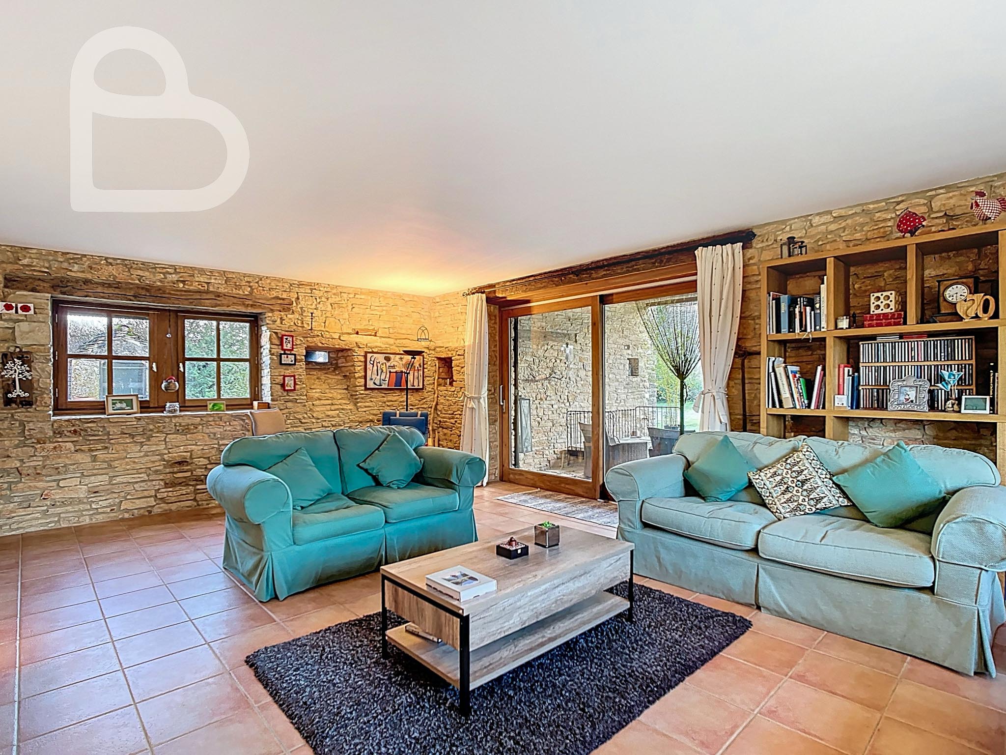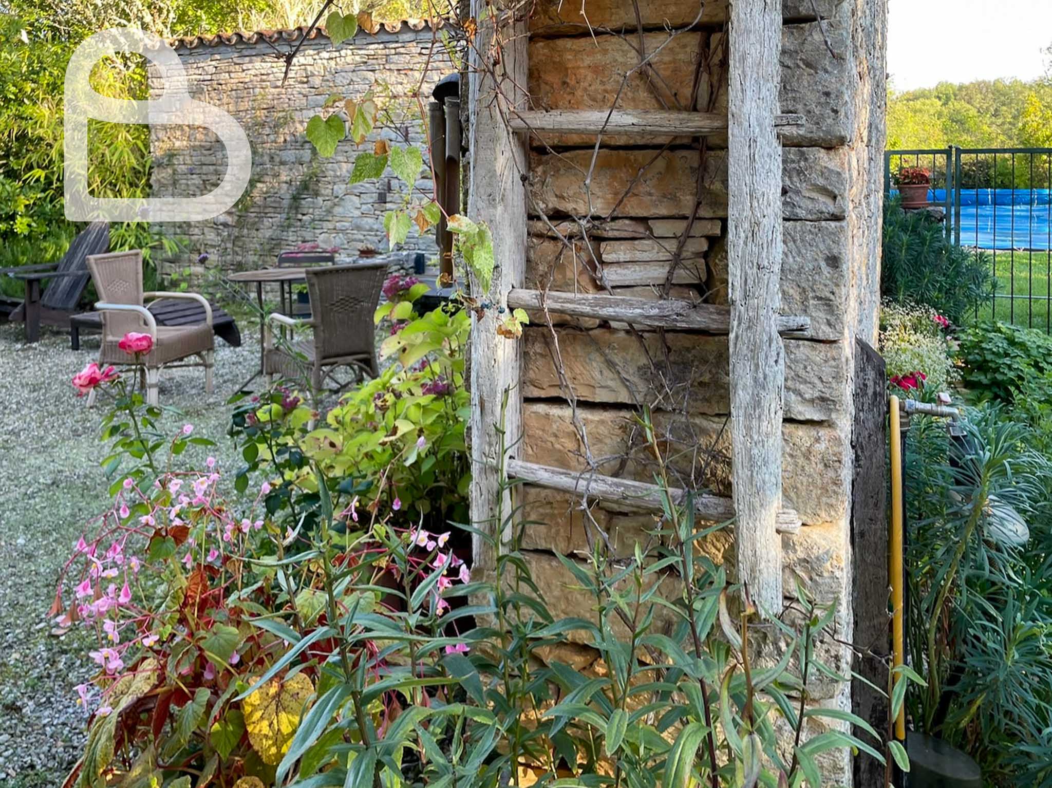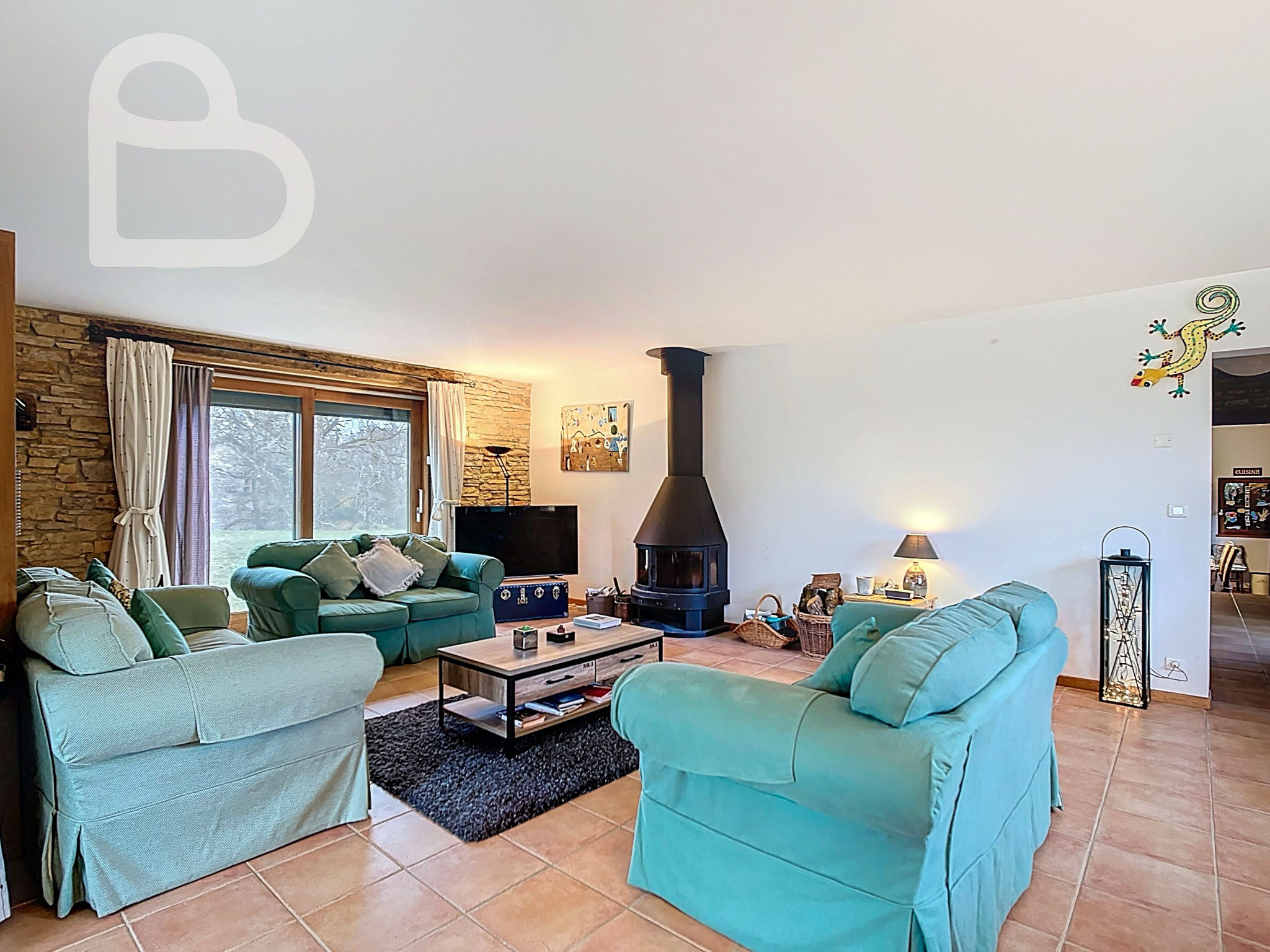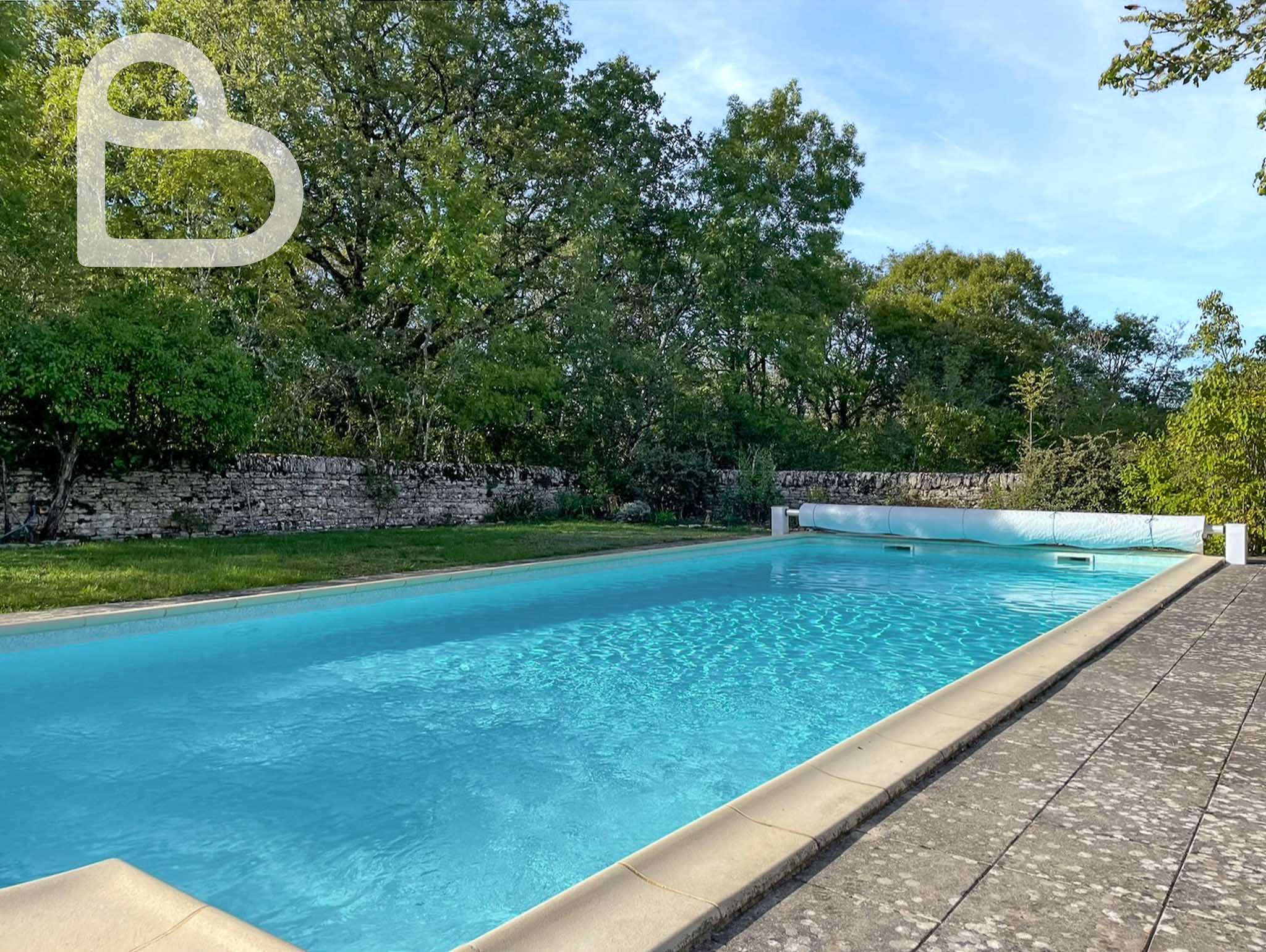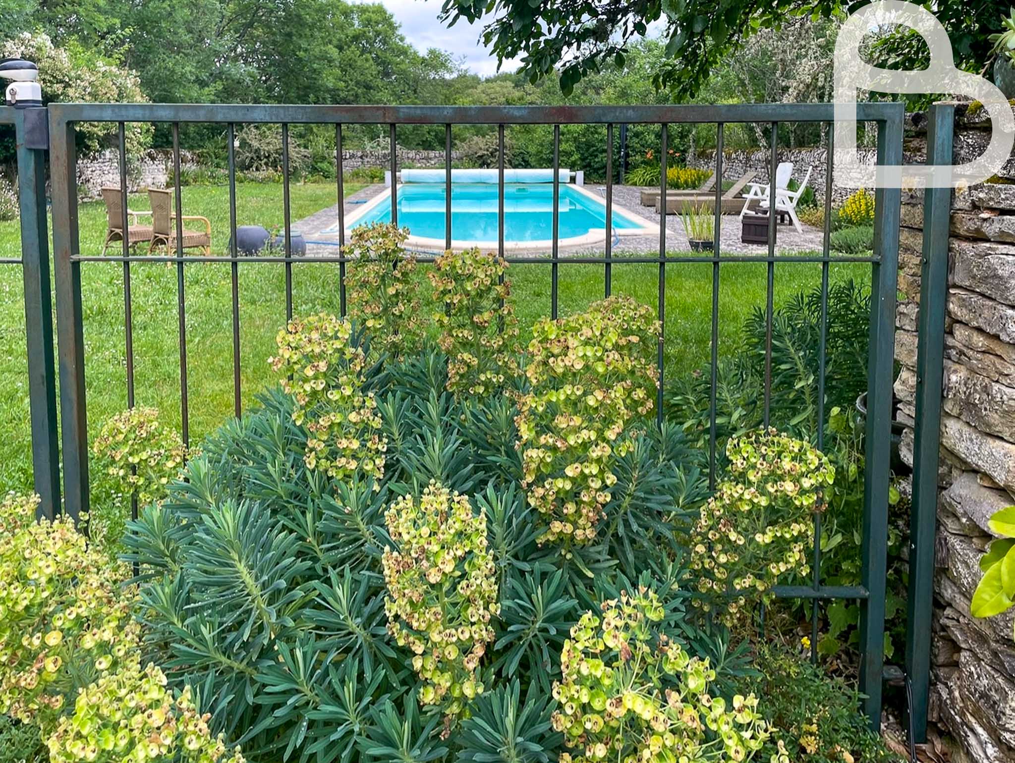 Le jardin paysager accueille une piscine de 12 x 6 mètres, entièrement sécurisée par un mur en pierre et harmonieusement intégrée dans son environnement naturel. En fond de parcelle, un bois privé, faisant partie intégrante de la propriété, préserve l’intimité et renforce le sentiment de calme absolu.