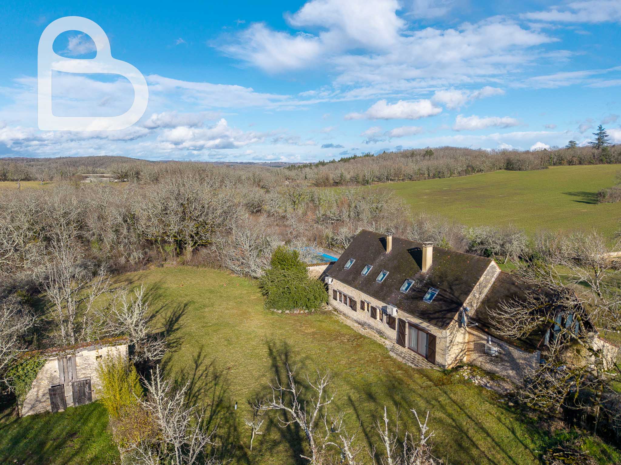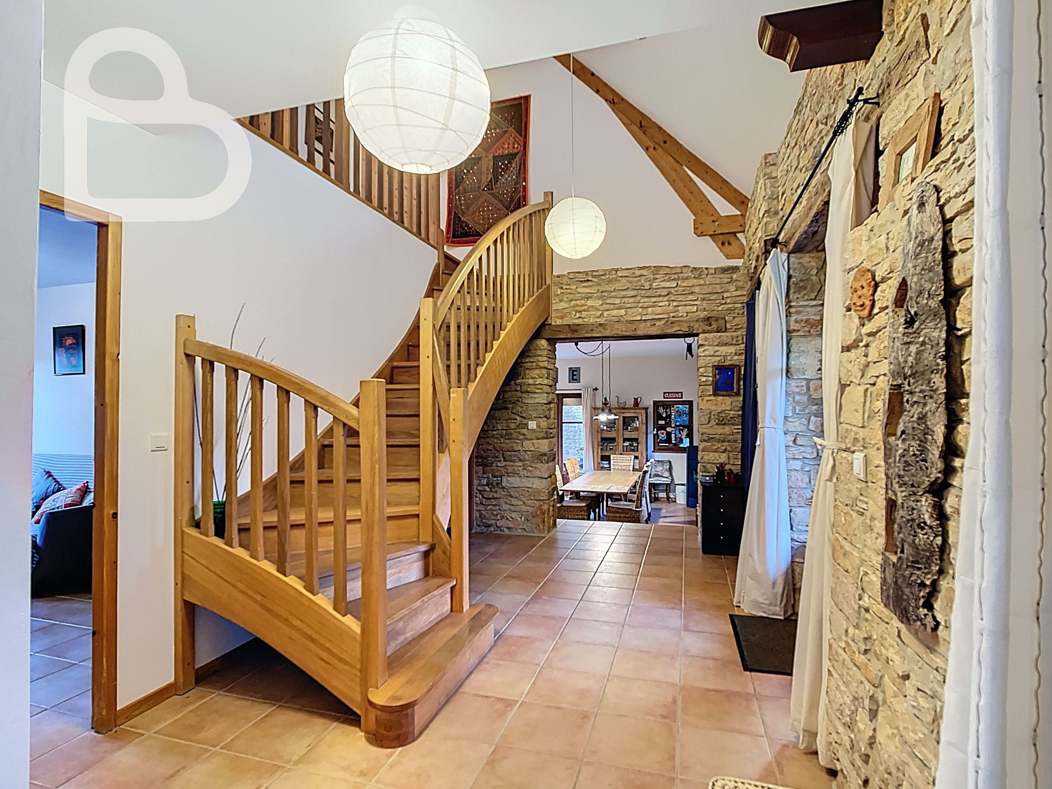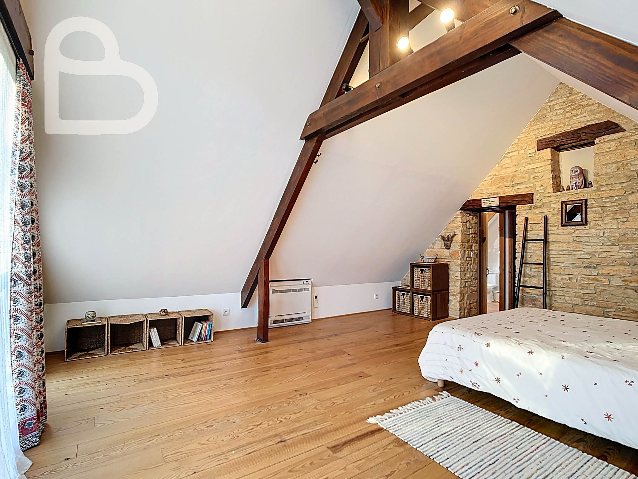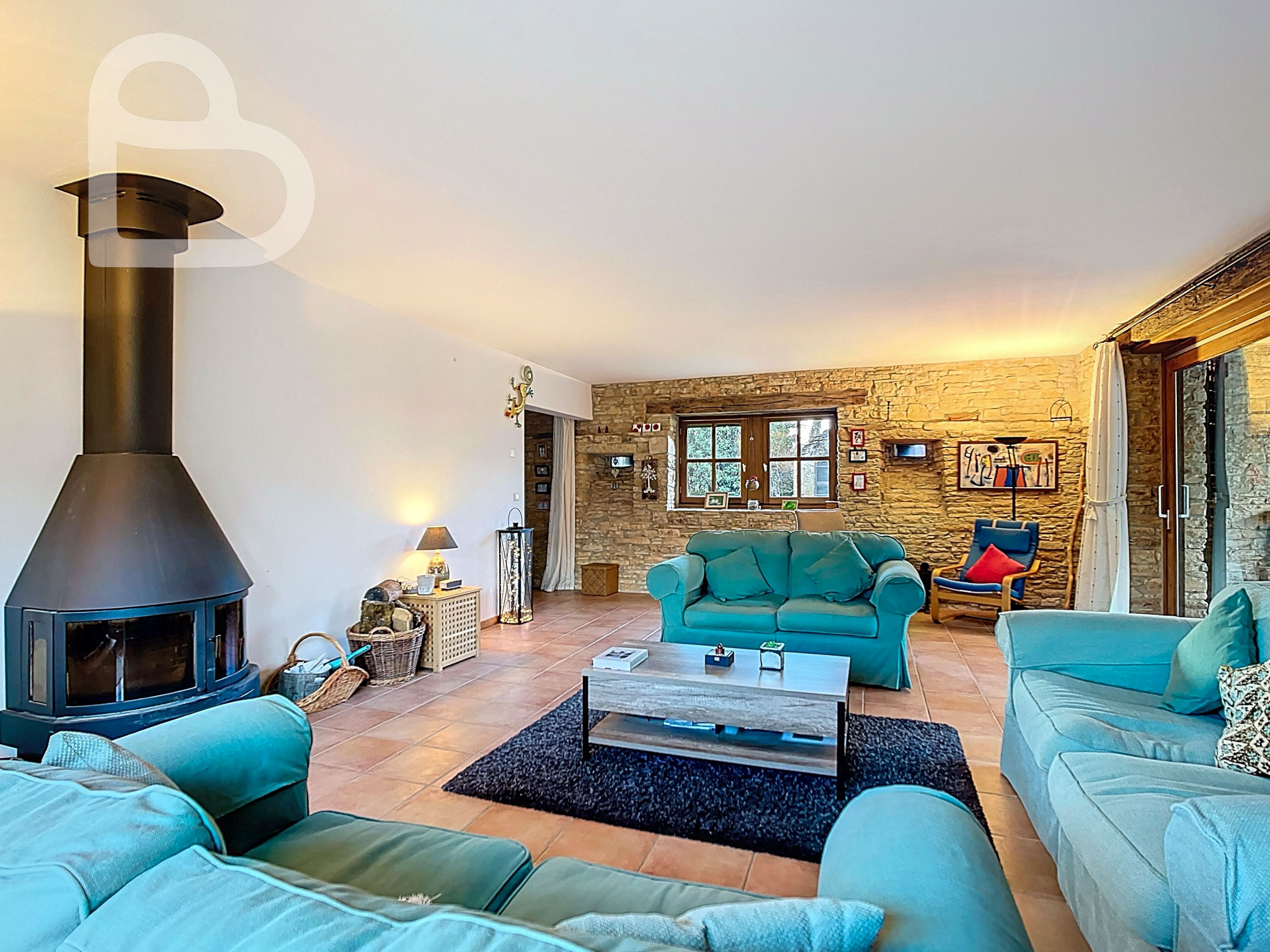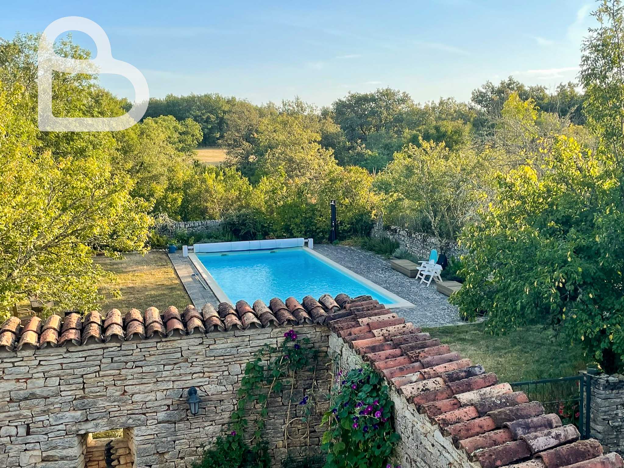 Le jardin paysager accueille une piscine de 12 x 6 mètres, entièrement sécurisée par un mur en pierre et harmonieusement intégrée dans son environnement naturel. En fond de parcelle, un bois privé, faisant partie intégrante de la propriété, préserve l’intimité et renforce le sentiment de calme absolu.