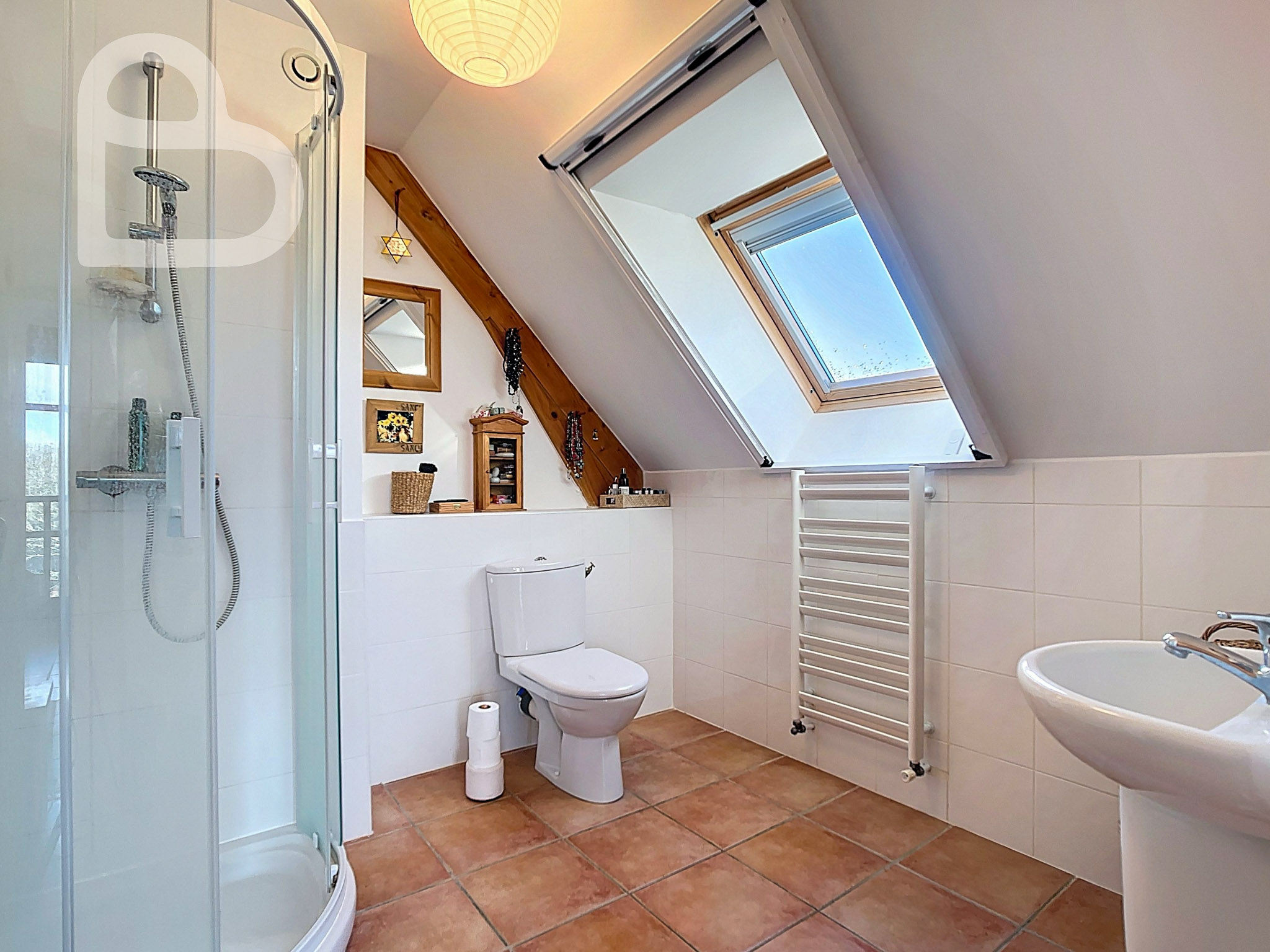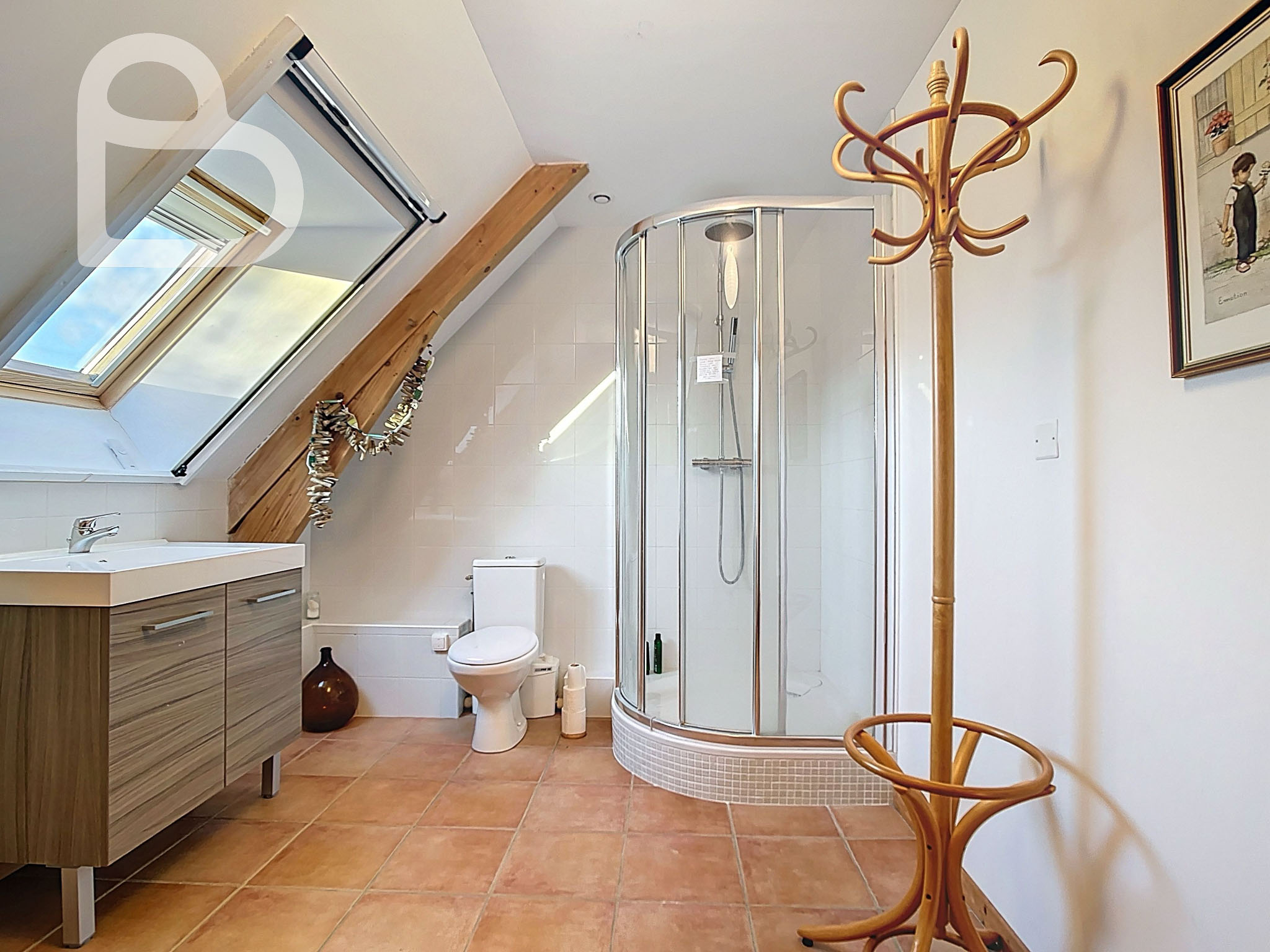 Ce niveau comprend également une chambre pouvant faire office de bureau, avec salle de bains attenante, ainsi que l’escalier menant à l’étage, l’ensemble étant accessible depuis le hall.