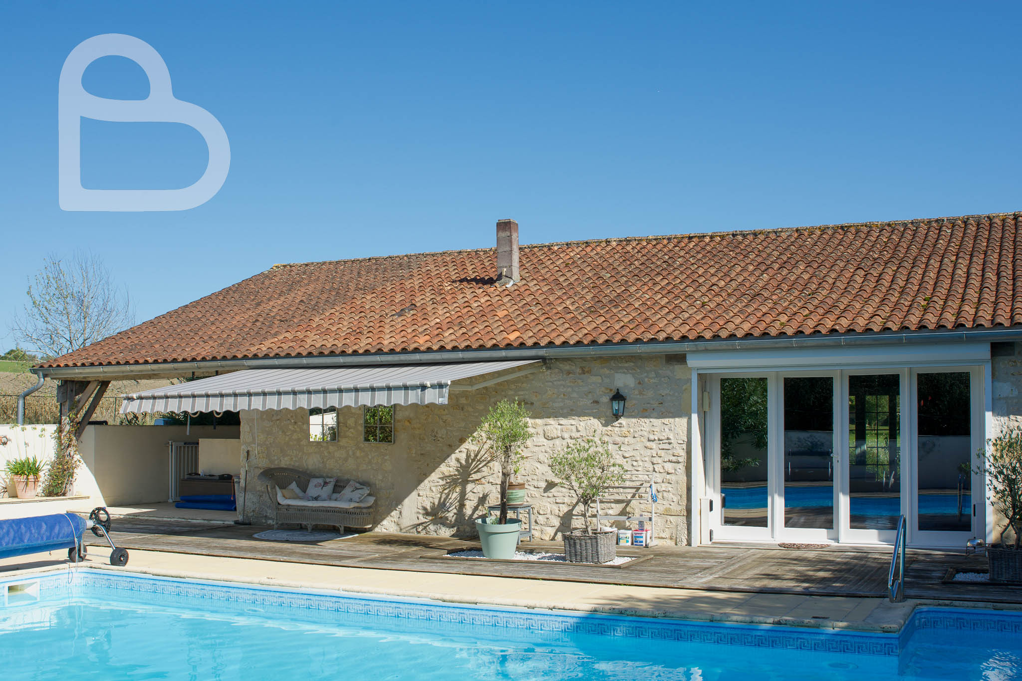 À l’avant, une vaste terrasse carrelée et couverte permet de profiter de la vie en plein air tout au long de l’année.