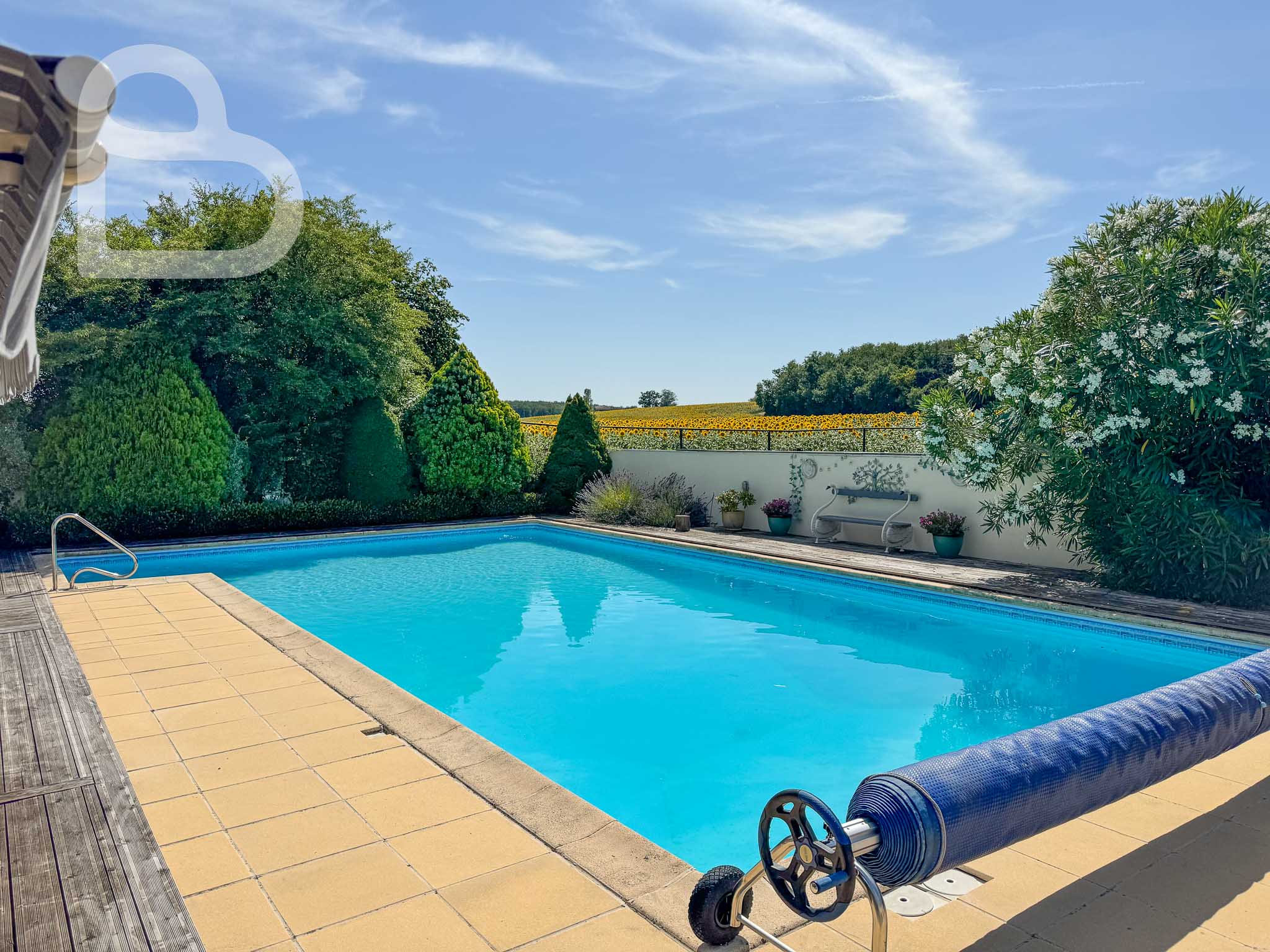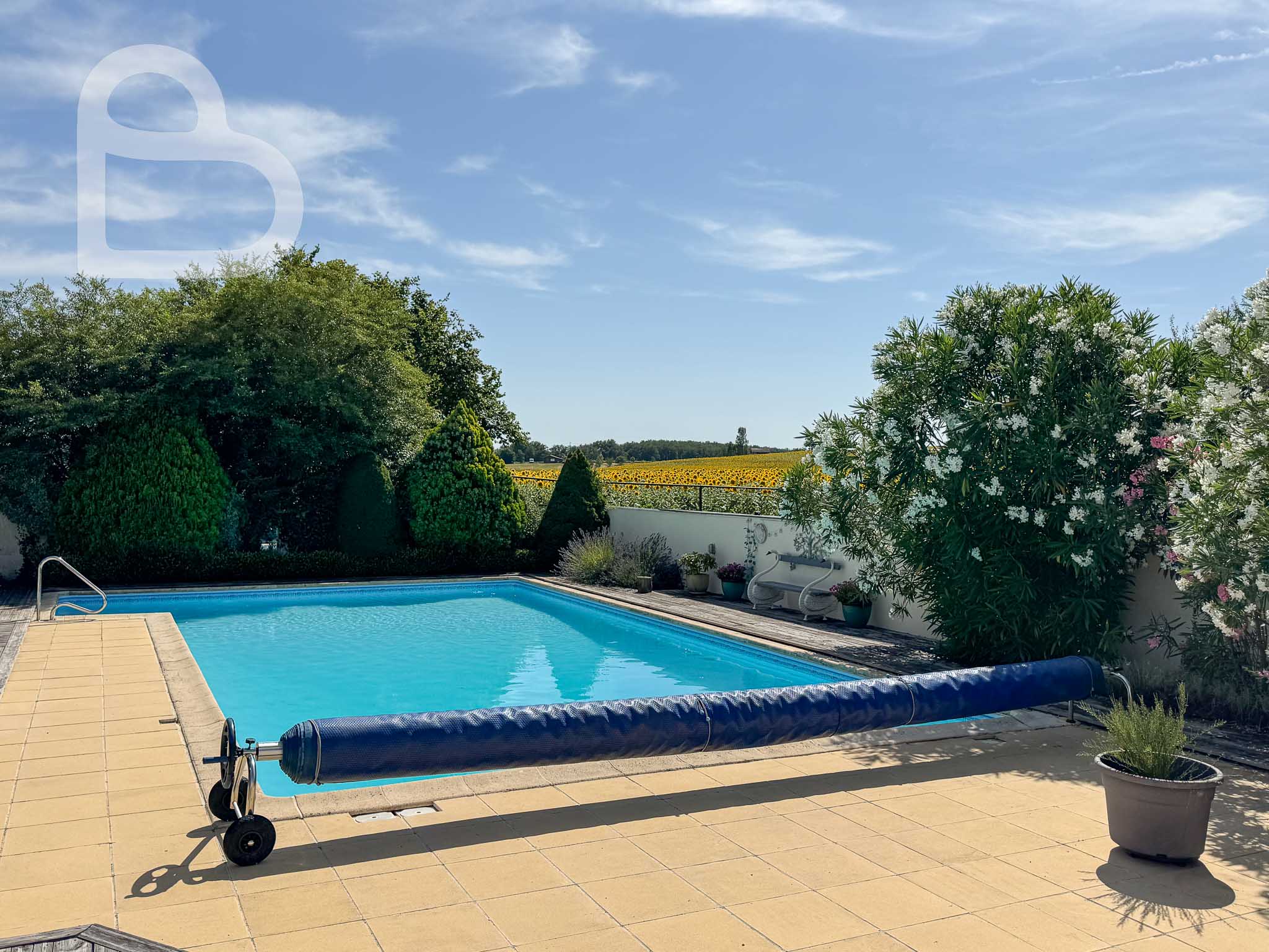 De l’autre côté de la maison se trouve un magnifique espace paysager entièrement clos et sécurisé autour d’une grande piscine de 12 x 6 mètres, un véritable havre de paix. La piscine a récemment été équipée d’une nouvelle pompe à chaleur (année 2024) et est entourée d’une terrasse ensoleillée et d’une végétation florissante.