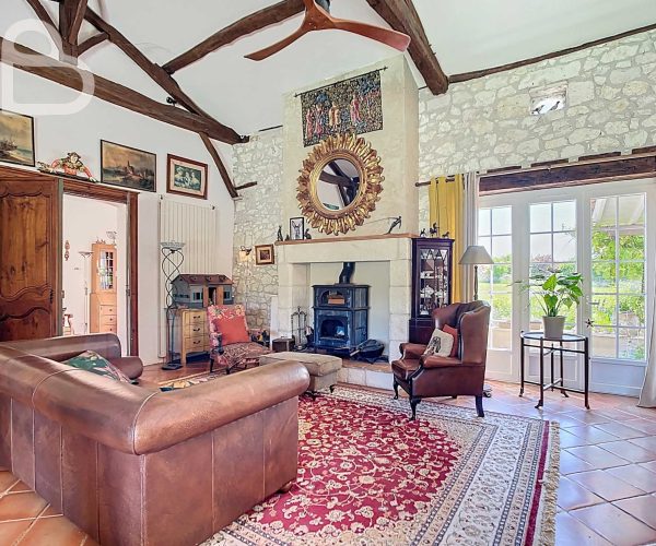 - Un vaste séjour lumineux avec poêle à bois dans une grande cheminée ouverte, plafond cathédrale et larges baies vitrées ouvrant sur les deux côtés de la maison