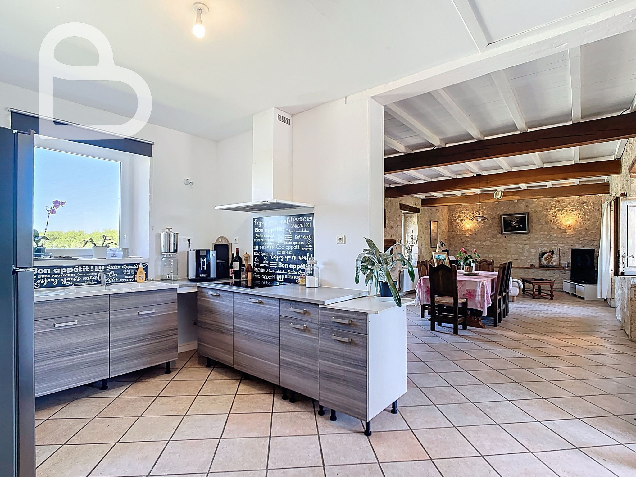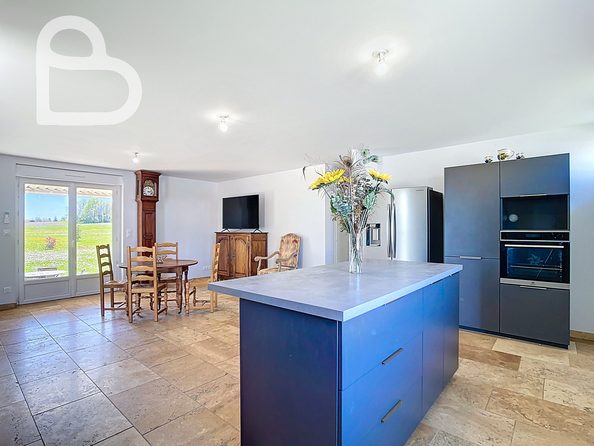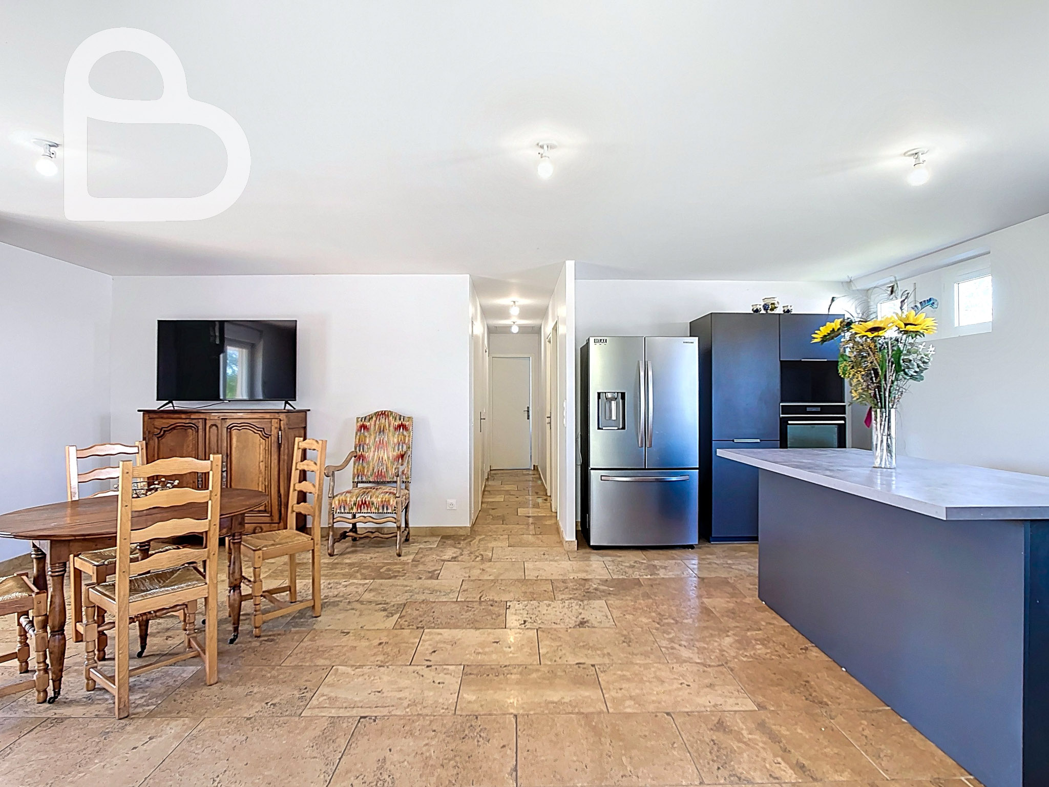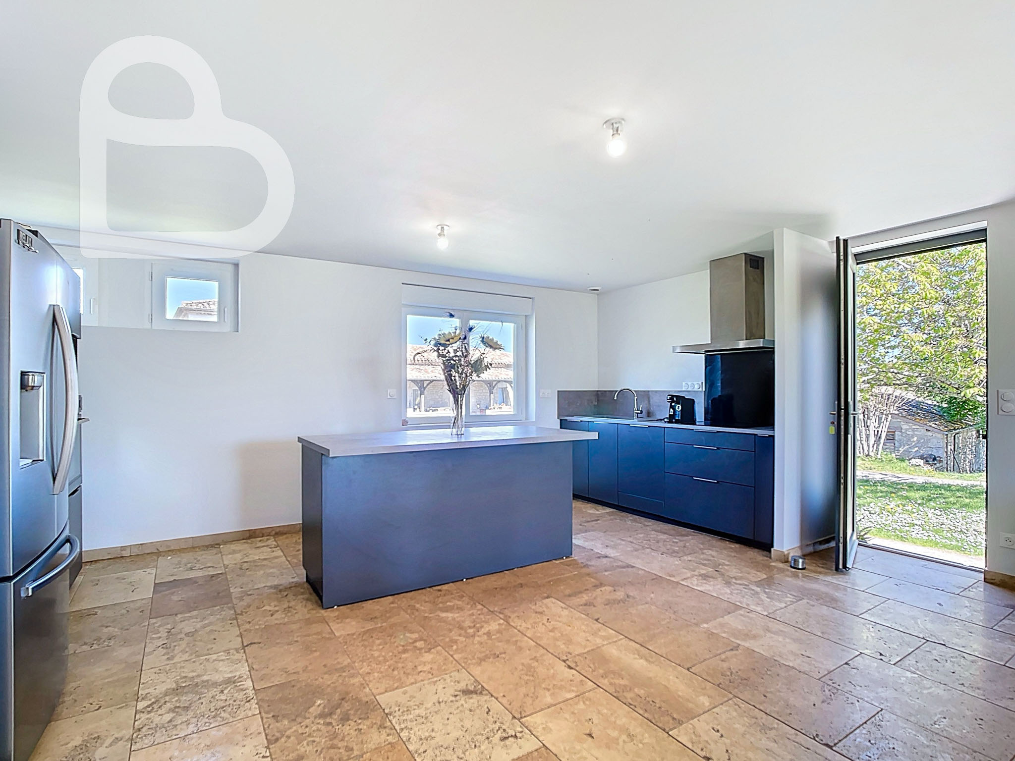 Entièrement de plain-pied et en excellent état, la seconde maison propose un espace de vie moderne et ouvert avec cuisine équipée, sublimé par un élégant sol en pierre naturelle.