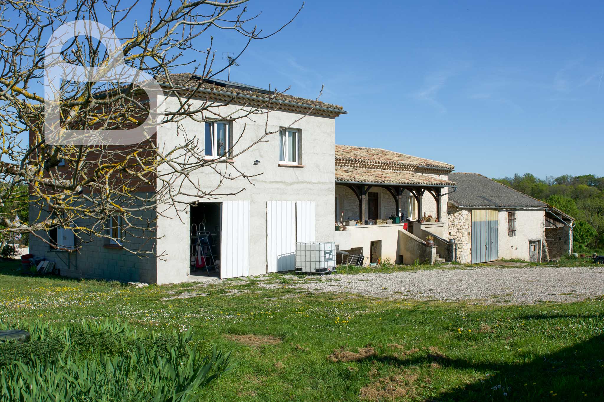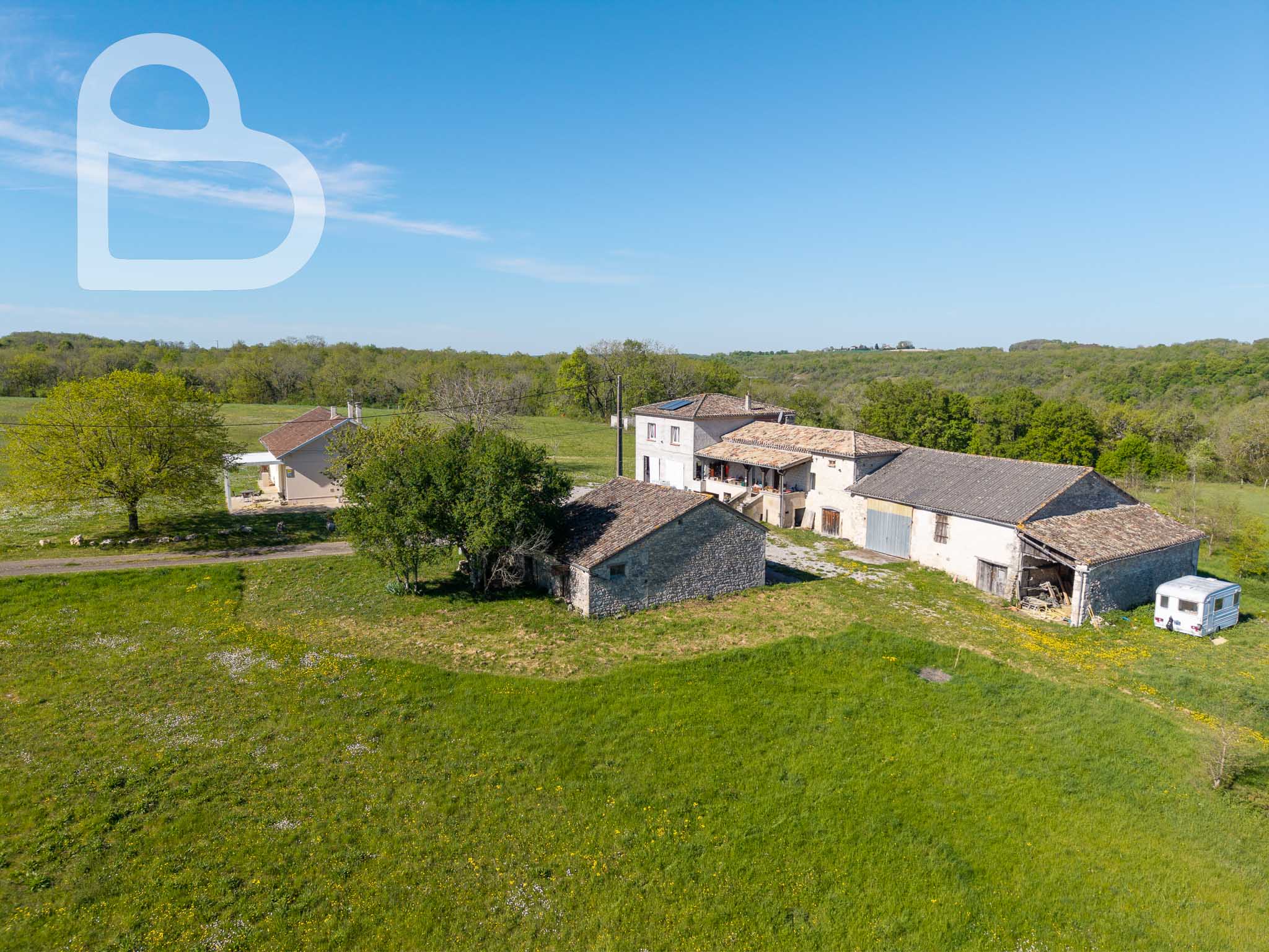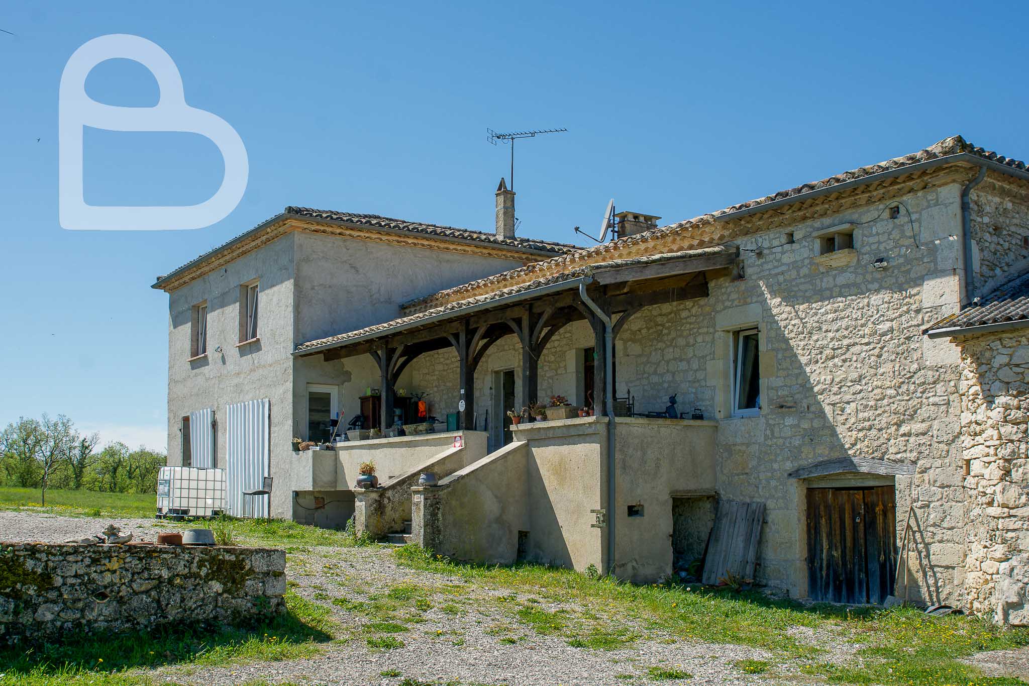 Attenantes à la maison principale, plusieurs dépendances sont présentes, dont une grande grange en pierre, une cave à vin et un espace couvert.