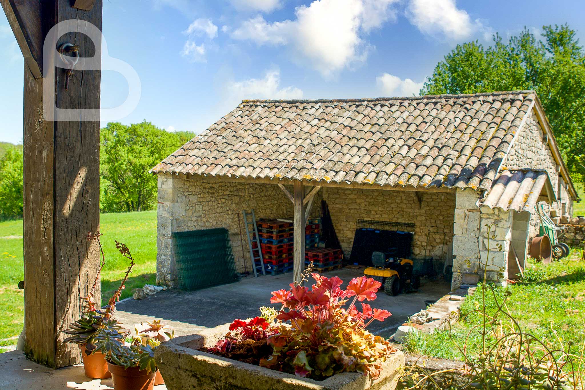 En face, un hangar ouvert permet de stationner deux véhicules à l’abri.